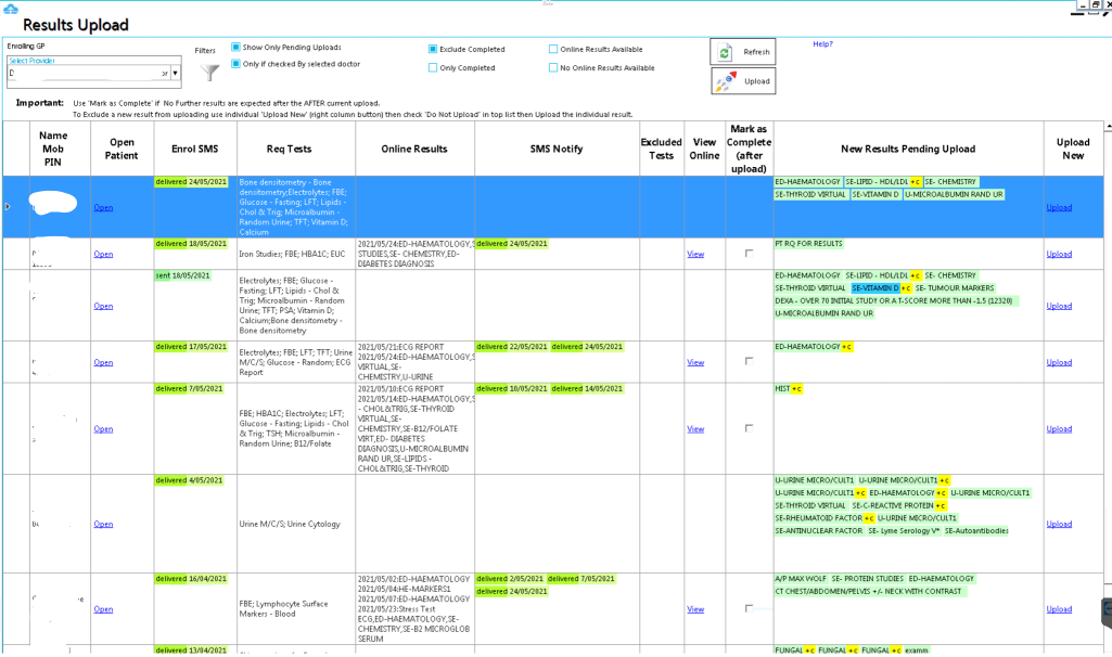Patients will receive SMS notification if any of the results are uploaded (unchecked in left column).